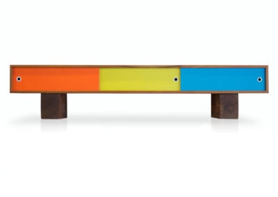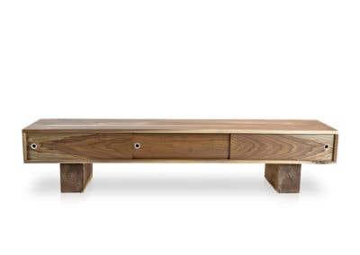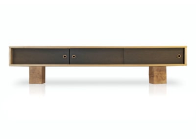 Low flung media console with three sliding doors. Sitting on scaled down beam legs, the Pawnee is perfect for media devices, such as TVs, turntables, speakers, etc. This console helps to hide the clutter that comes with these electronic devices. The Pawnee is a captivating luxury console, offered in a variety of wood and paint schemes.